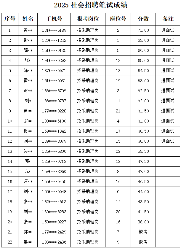 此次筆試分數(shù)按百分制計算,成績由高到低排序,依據(jù)崗位筆試得分情況,按不低于 1:3 的比例確定進入面試人員名單,具體如下:招采助理崗招錄4名,確定筆試排名前12名人員進入面試。如果排名存在筆試分數(shù)一樣的情況,則獲得該分數(shù)的全部人員均進入面試環(huán)節(jié)。現(xiàn)將筆試結(jié)果予以公布,具體筆試成績及排名情況如下。